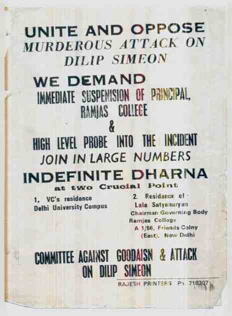 - Poster calling for Indefinite sit-in following attack on Dilip Simeon, history lecturer at Ramjas College, University of Delhi [Feb 1982]
