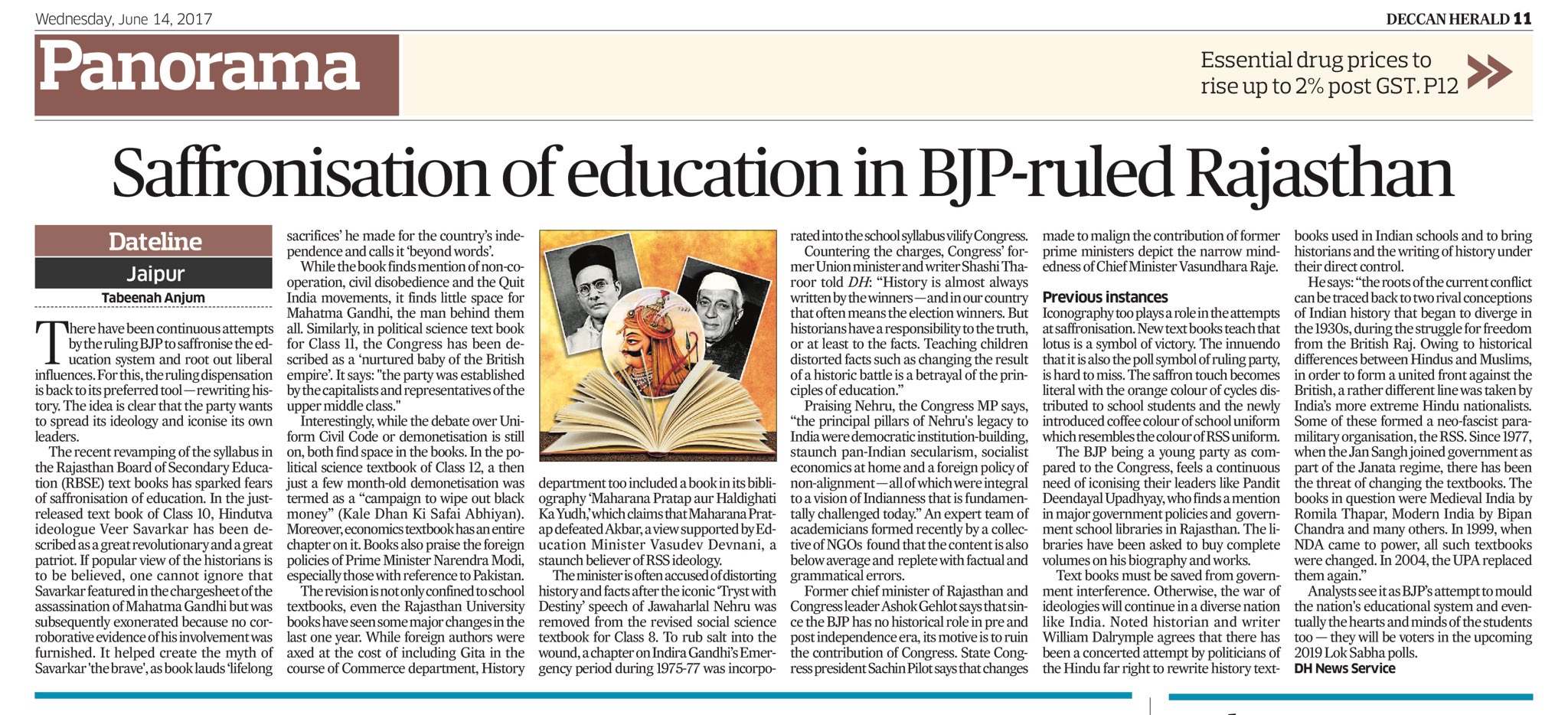 The revision is not only confined to school textbooks, even the Rajasthan University books have seen some major changes in the last one year. While foreign authors were axed at the cost of including Gita in the course of Commerce department, History department too included a book in its bibliography ‘Maharana Pratap aur Haldighati Ka Yudh,’ which claims that Maharana Pratap defeated Akbar, a view supported by Education Minister Vasudev Devnani, a staunch believer of RSS ideology.