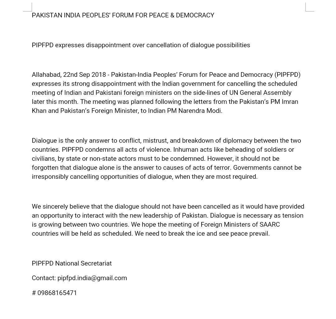 The Pakistan-India Peoples Forum for Peace and Democracy (PIPFPD) has expressed disappointment over the cancellation of a potential meeting between Pakistani and Indian foreign ministers on the sidelines of the United Nations General Assembly in New York in the coming week.